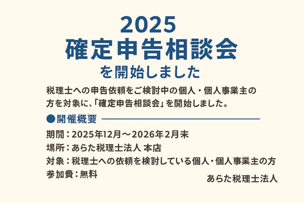 あらた税理士法人では、2025年分の確定申告に向けて、「税理士事務所への申告依頼をご検討中の個人・個人事業主の方を対象に「確定申告相談会」を開始いたしました。